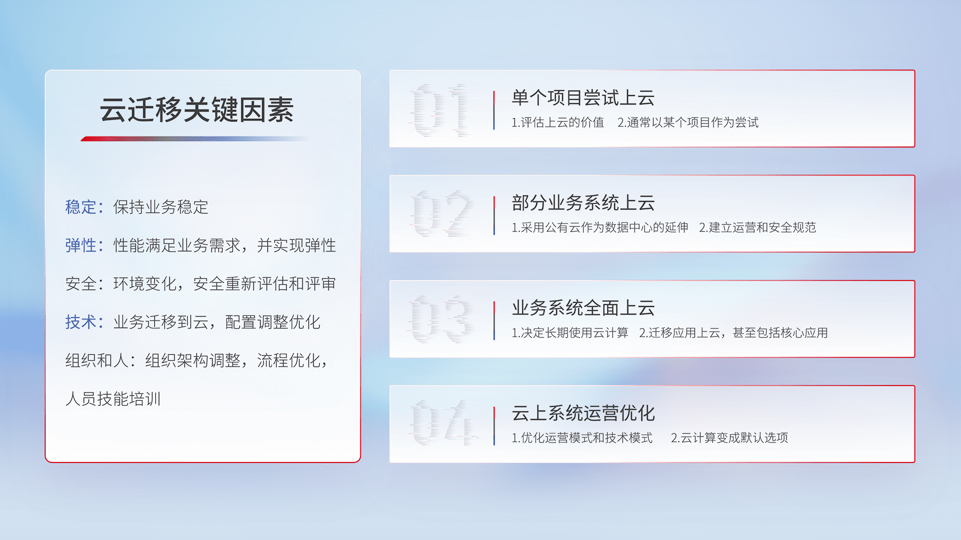 结合实际业务,,,从规划设计、、、云平台选型、、、云原生改造、、、、数据迁移、、集成交付,,迁移全过程为客户识别最佳上云路径,,做好风险识别管理,,,,设计网络架构、、身份权限、、、、安全审计合规、、、操作审计、、、日志审计、、监控告警策略、、、多站点容灾设计等,,对云上基础设施进行整体规划,,,,提升IT治理水平,,,以满足弹性、、、、高可用、、、高性能的需求。。。