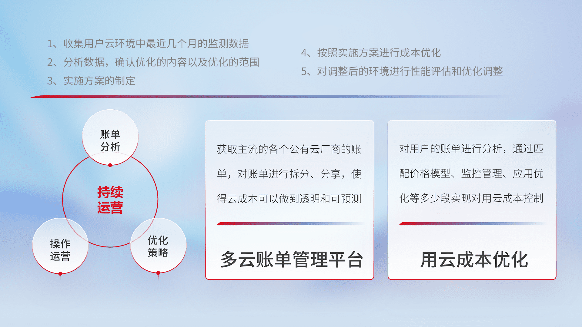 通过多云纳管,,以统一的资源数据模型把客户的云资源进行抽象和封装,,,进而实现对多云资源的统一操作,,,保障云资源管理的可靠性、、稳定性与可用性。。。。量身定制化运维内容,,,配置、、、开发运维、、、、补丁管理、、、备份、、、、监控、、、认证和访问管理、、审计和日常巡检等,,,,保障在用云过程中的可靠度,,稳定度以及高可用率。。。