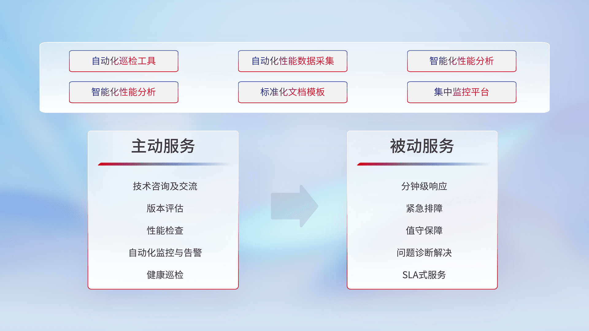 智能化工具和标准化文档,,,保障服务质量,,提供主动服务(包含技术咨询、、、、版本评估、、性能检查、、自动化监控与告警、、、、健康巡检)和被动服务包含(分钟级响应、、、紧急排障、、、值守保障、、问题诊断解决、、SLA服务)。。